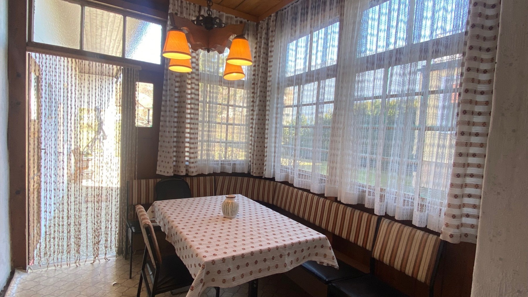 Holzveranda, mit Ausgang in den Garten