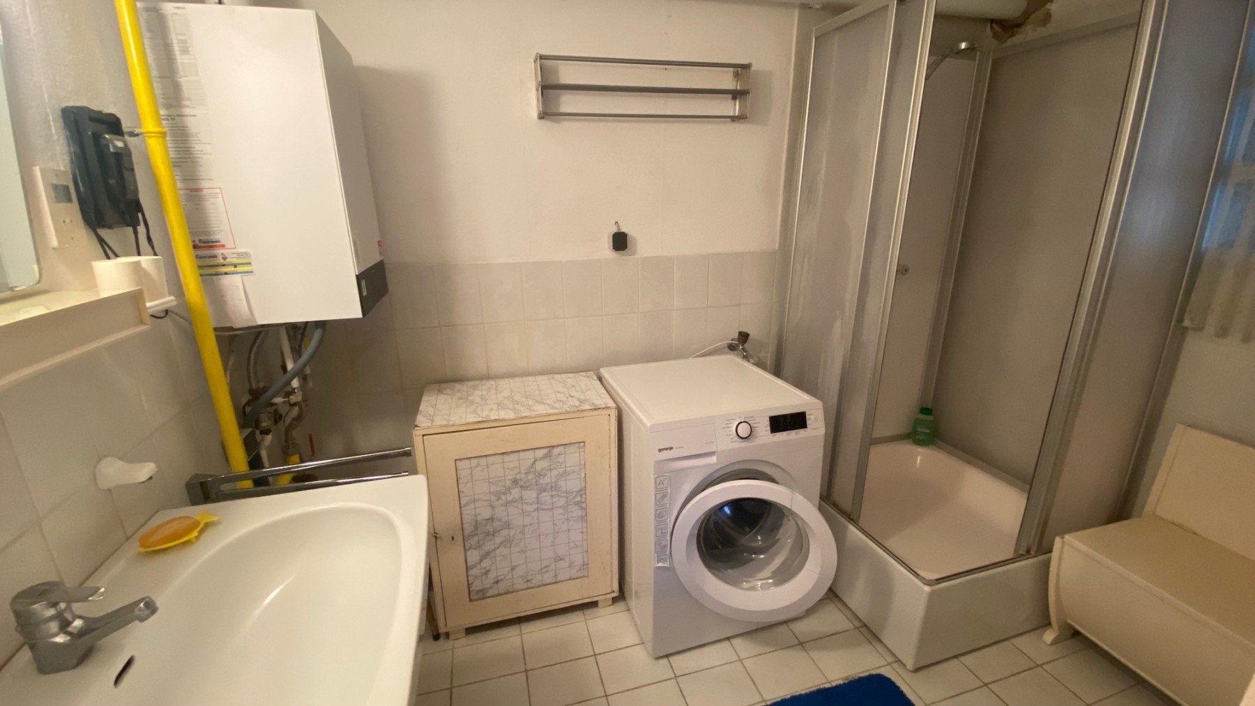 Bad und WC getrennt, kleiner Vorraum. (Bad: Waschbecken, Dusche, Waschmaschine. Im Bad befindet sich auch das Gas-Brennwertgerät für Heizung und Warmwasser).